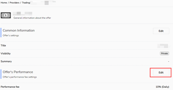 لا يمكن للمزودين تعديل العروض إلا بدون أي متابعين نشطين. لتعديل العروض، قم بتسجيل الدخول إلى بوابة VTrade، وانتقل إلى صفحة العرض وانقر على """"تعديل"""" بجوار حقل """"عمولة مزود الاستراتيجية"""". إذا لم يكن هناك متابعون مشتركون في العرض، فيمكن تعديله.