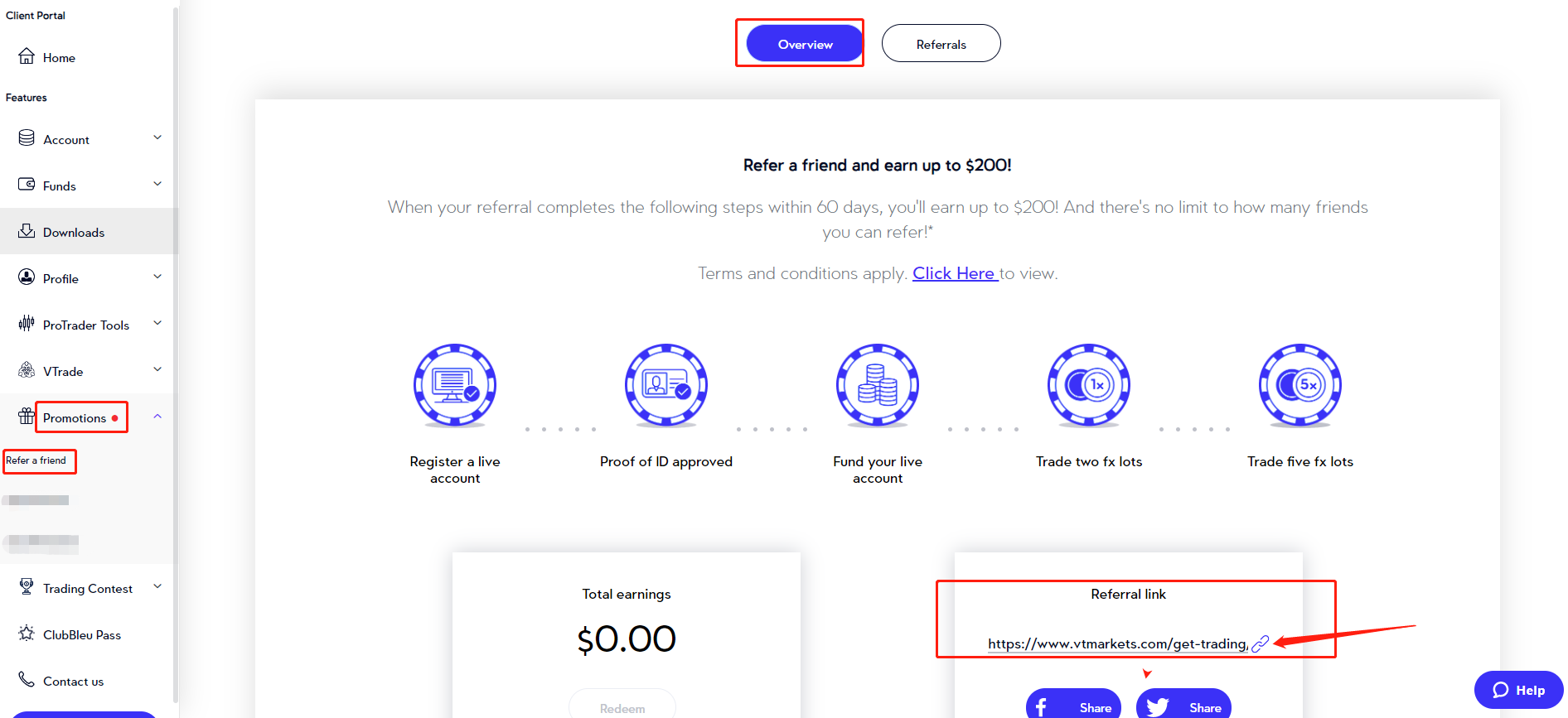 يمكنك الوصول إلى رابط الإحالة الخاص بك عن طريق زيارة "العرض الترويجي" > "إحالة صديق" في بوابة العميل.