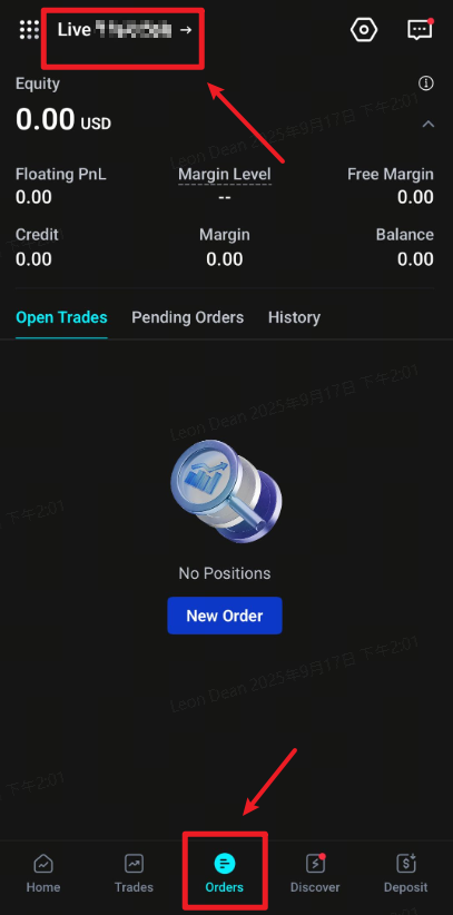 في تطبيق VT Markets، ما عليك سوى الانتقال إلى "صفحة الأوامر" والنقر على "رقم الحساب" في الجزء العلوي للوصول إلى صفحة إدارة الحساب، ثم النقر على "حساب حقيقي جديد" لطلب حساب تداول إضافي.