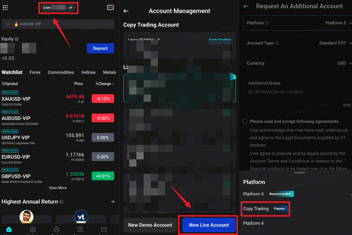 يمكنك فتح حساب تداول نسخ بسهولة عبر تطبيق VT Markets أو بوابة العملاء باتباع الخطوات التالية: