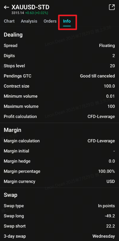 Click on the product name (symbol) on the "Trades" page, then click on the "info" at the top right to check the specification page of each product.