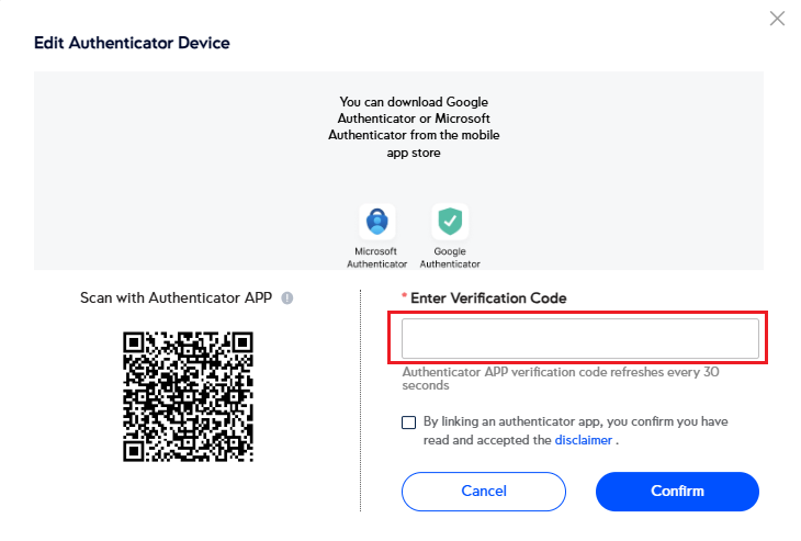 After clicking "Confirm", you will be required to input the OTP from your current security authenticator. This step is to verify that you are the owner of the current device.