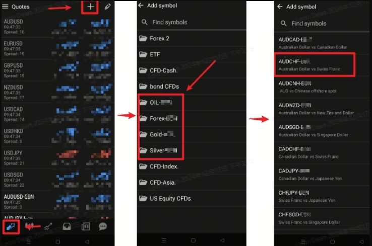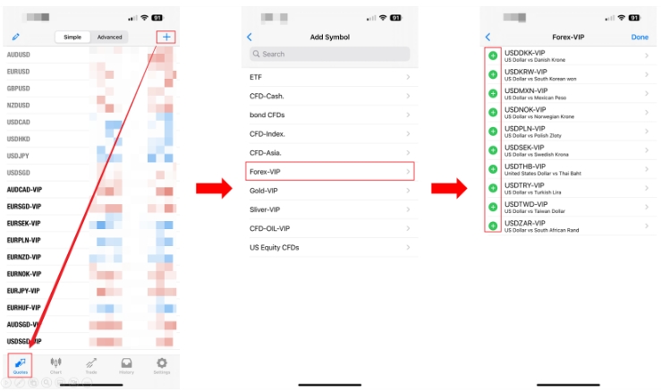 In the Quotes tab, you will see a list of active symbols. Look for the ""+"" icon in the upper-right corner of the screen and tap on it.
