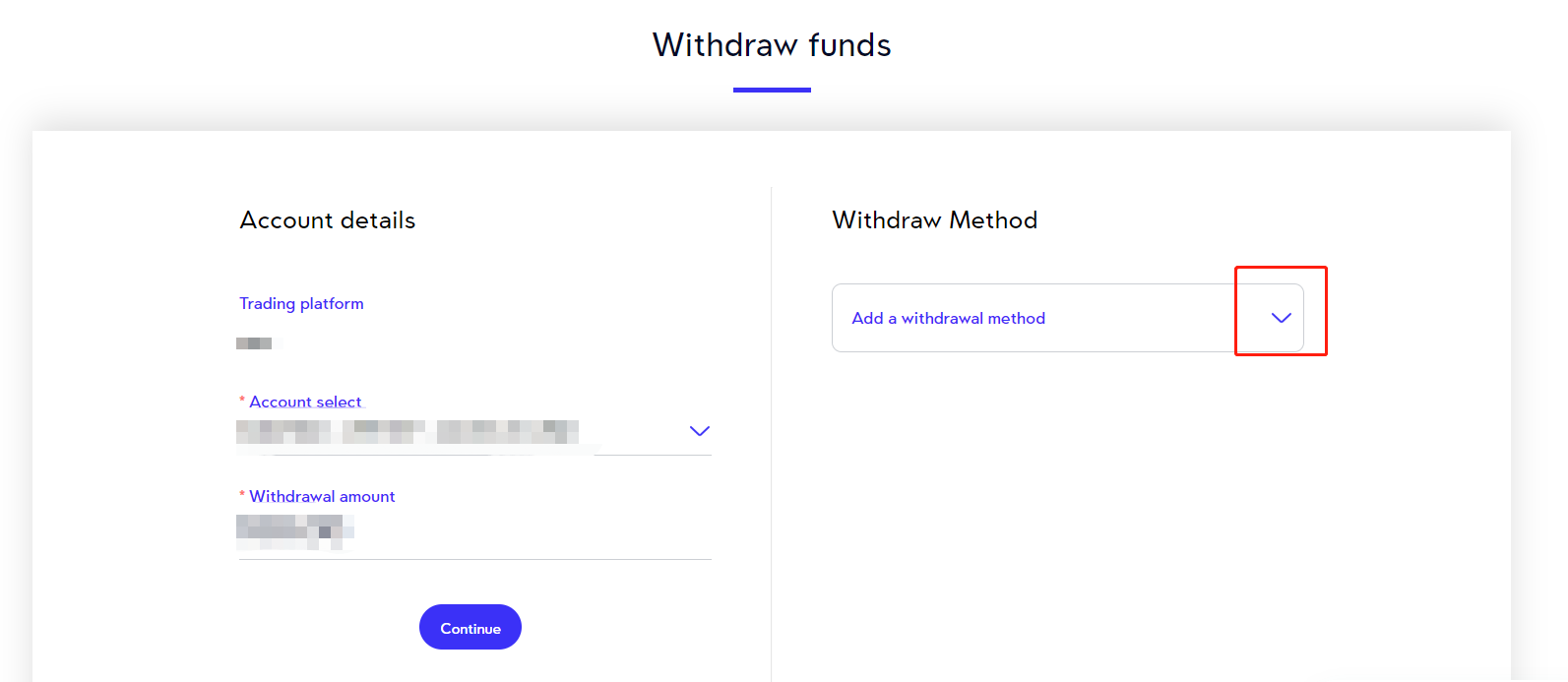 2. Go to "Funds" > "Withdraw funds" on the left sidebar, follow the instructions to select your trading account, and fill in the withdrawal amount.