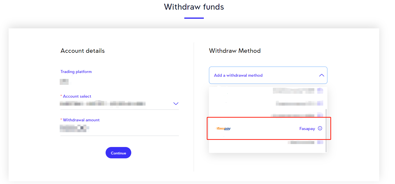 Para retirar dinero mediante el método de billetera electrónica, inicie sesión en el Portal del cliente y siga los pasos a continuación.