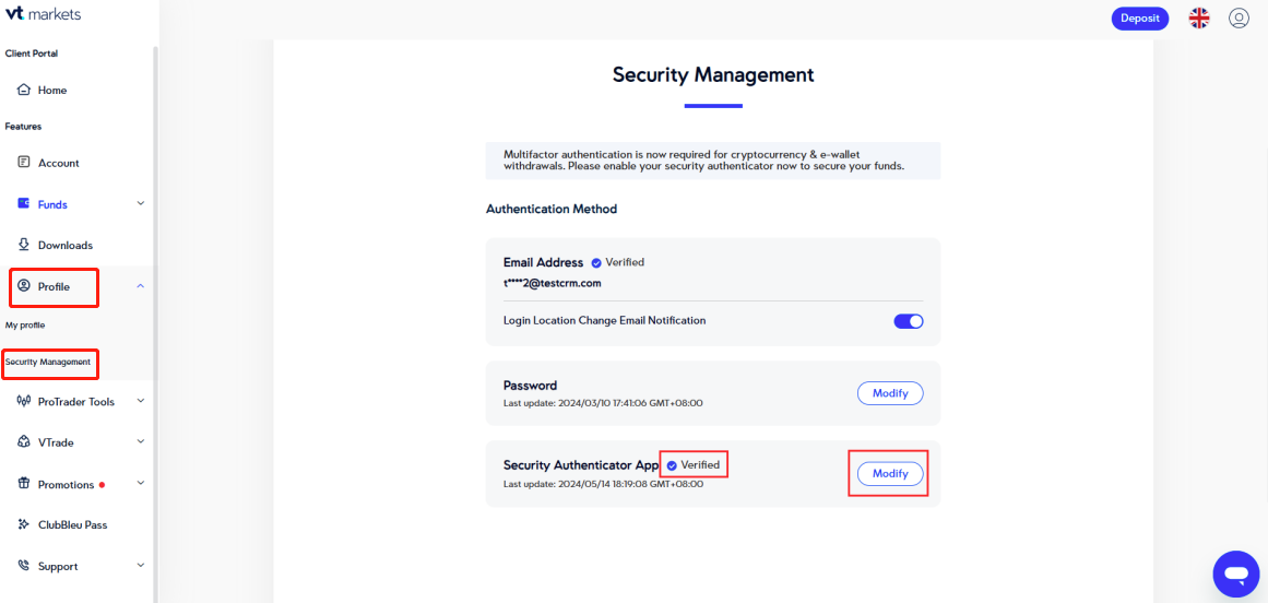 Al hacer clic en "Modificar", primero se le notificará sobre la restricción de retiro de 48 horas después de modificar su autenticador de seguridad.