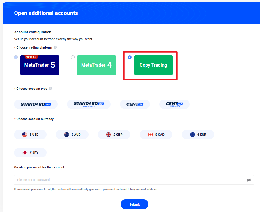 4. 取引プラットフォームとしてコピー取引を選択します。