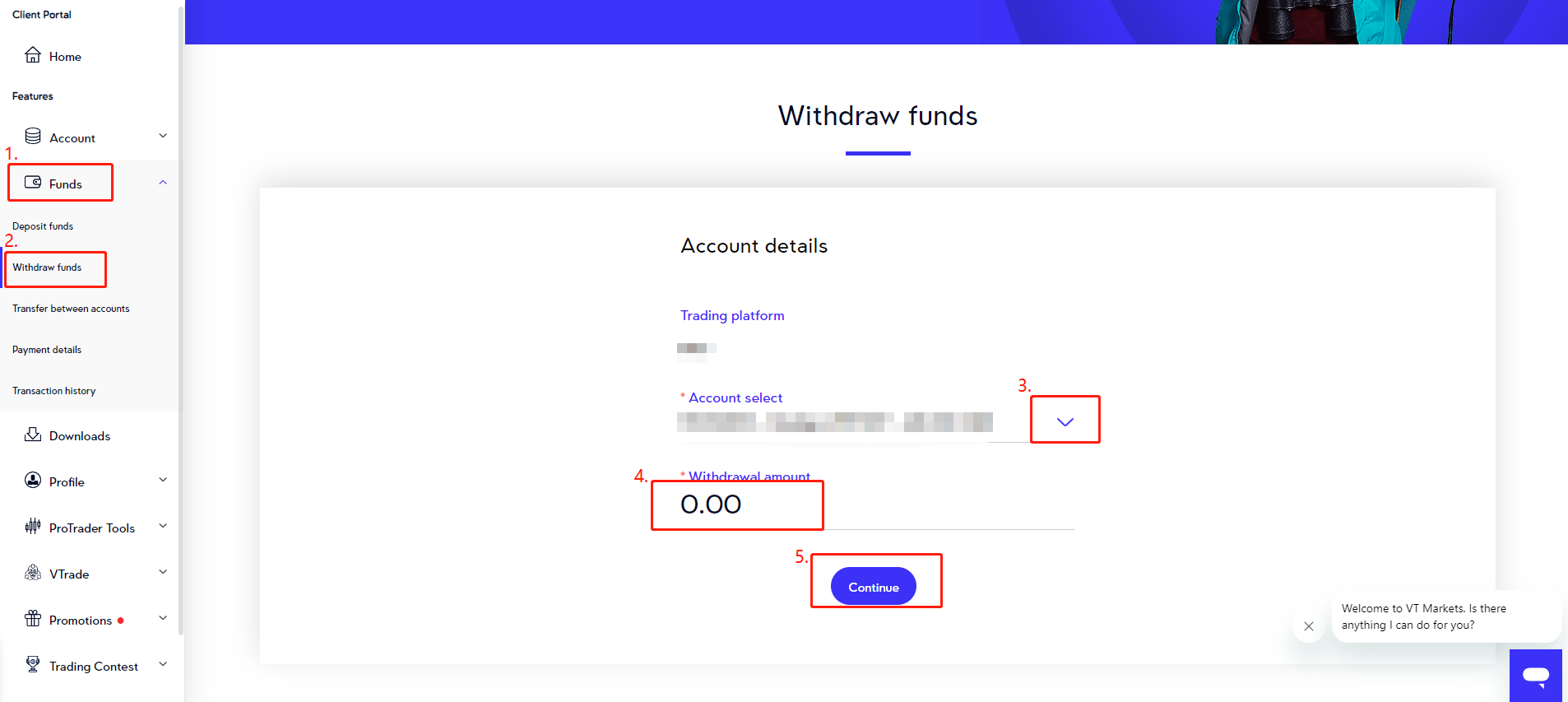 2. เลือกหมายเลขบัญชีการเทรดของคุณ และกรอกจำนวนเงินที่ต้องการถอน จากนั้นกด "ต่อไป"
