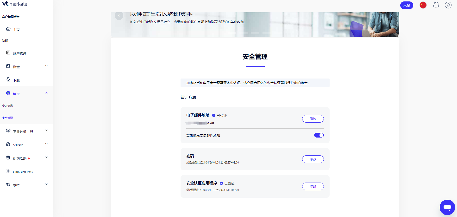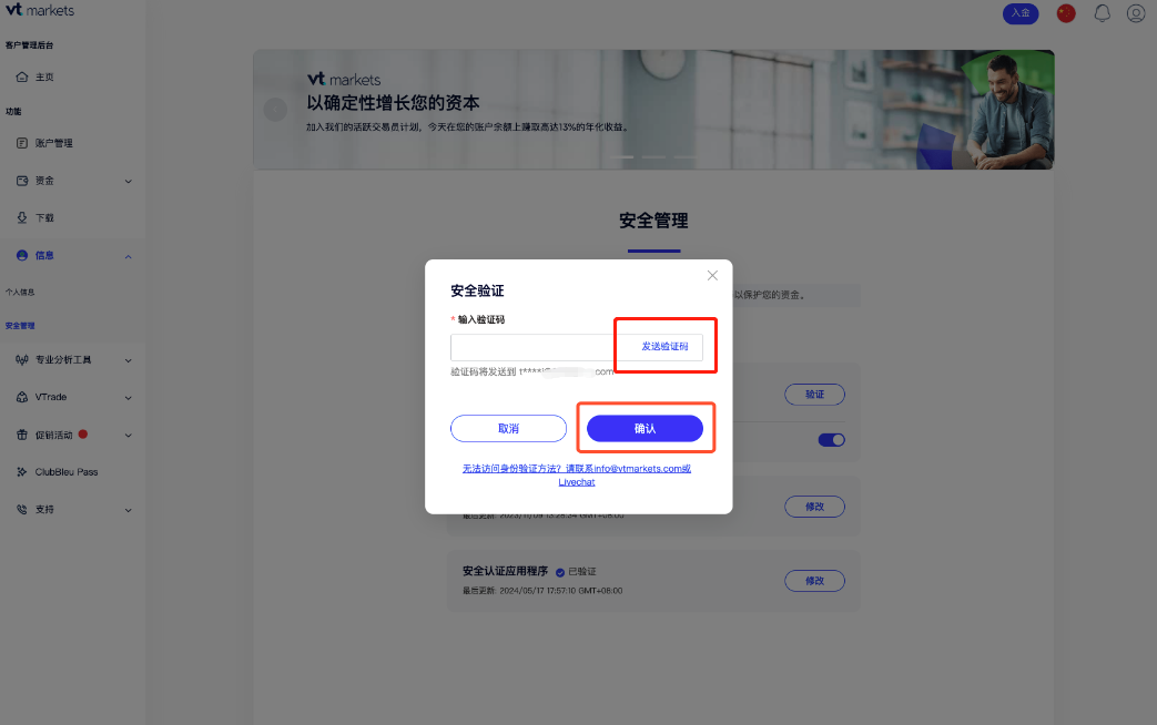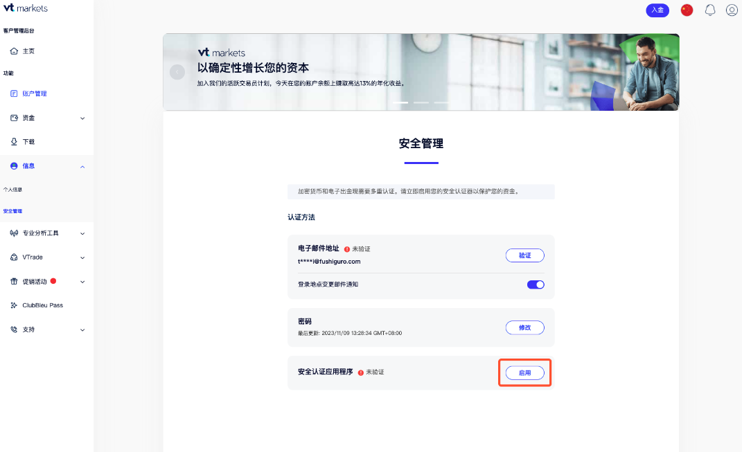 邮箱验证之后,此时安全认证器程序的状态为“未验证”。 您可以点击“启用”来绑定VT Markets 帐户。