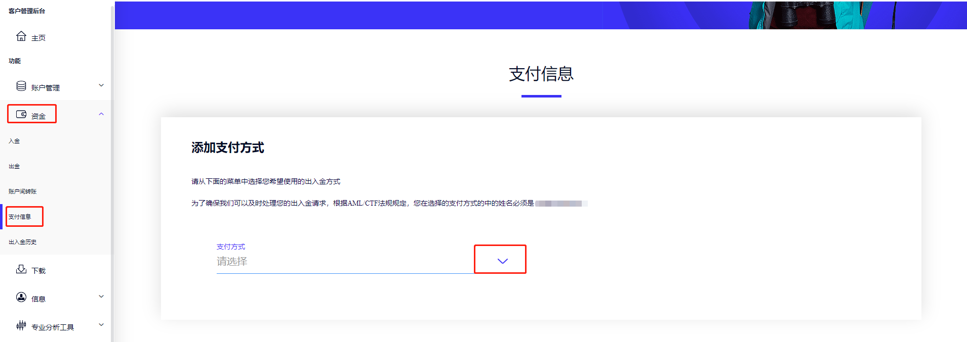 登录后选择左侧功能列表的「资金」>「支付信息」,添加您的提款银行卡信息。