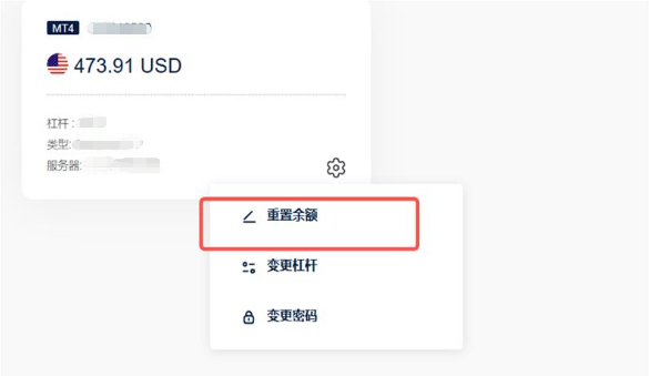 3. 选择 MT4/5 账户最右侧的“设置”,然后单击“重置余额”