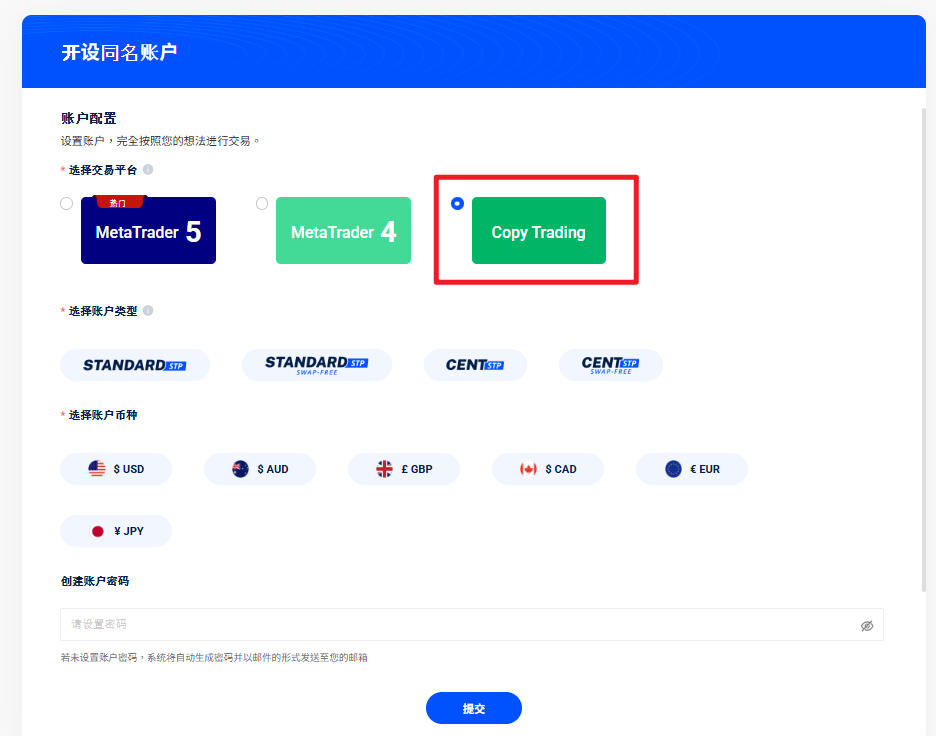 4. 选择跟单交易作为您的交易平台。