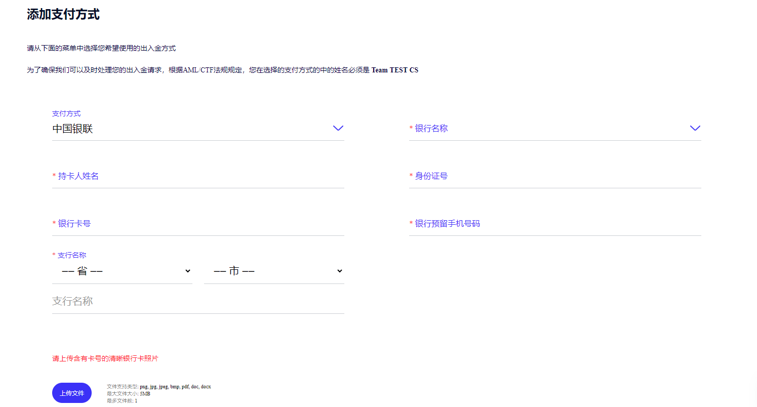2. 請在新增付款方式選擇中國銀聯,填寫所需資訊並上傳含有卡號的清晰銀行卡照片,點選提交。