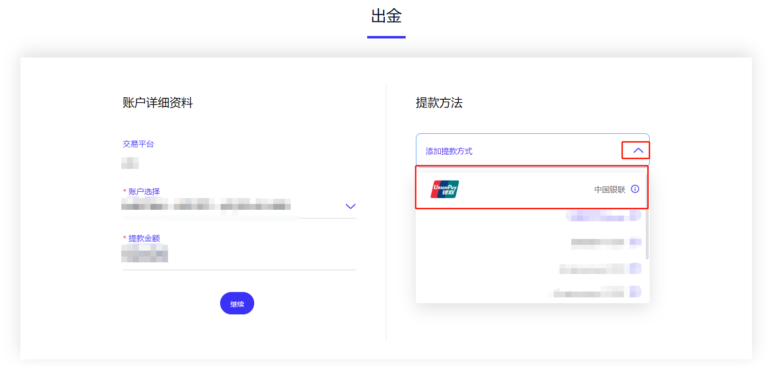3. 如您的銀聯卡資料完成核對後,請進入「出金」頁面,選擇您的交易帳號並填寫提款金額,然後按繼續。
